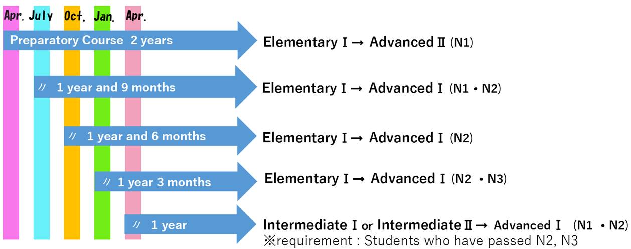 This long-term course is designed for students planning to go to university, graduate school or vocational college to develop 4 kinds of balanced skills, reading, speaking, writing and listening. Students will gain the 4 basic skills in a well-balanced curriculum. Including preparation for the Examination for Japanese University Admission for International Students (EJU) and the Japanese Language Proficiency Test (JLPT). Students will be able to acquire necessary level of Japanese languages proficiency for use in university or graduate school advancement.